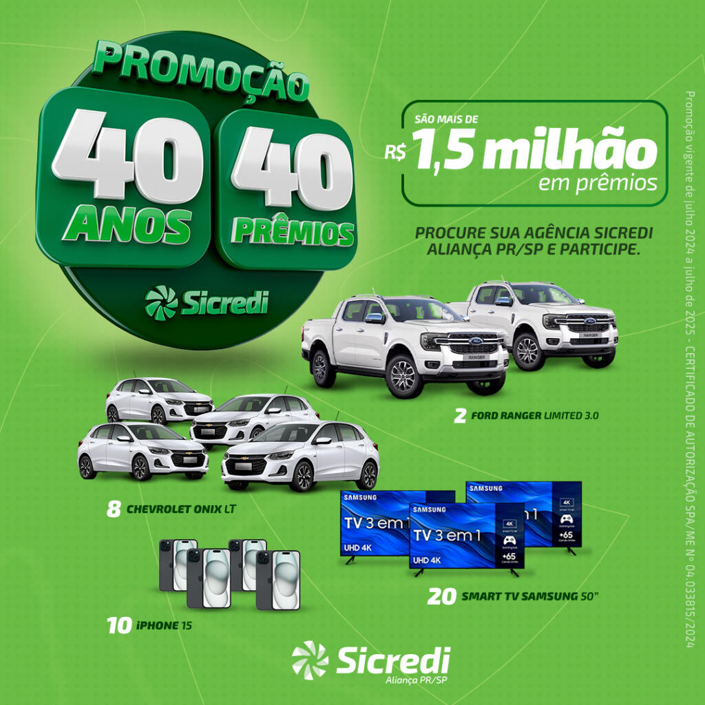 A Sicredi Aliança PR/SP lançou na sexta-feira (5) a campanha de comemoração do seu aniversário de 40 anos que acontece em julho de 2025. Ao todo serão mais de R$1,5 milhão de reais em prêmios. Essa é a maior campanha da história da cooperativa que começou em cinco de julho de 2024 e encerra em julho de 2025.