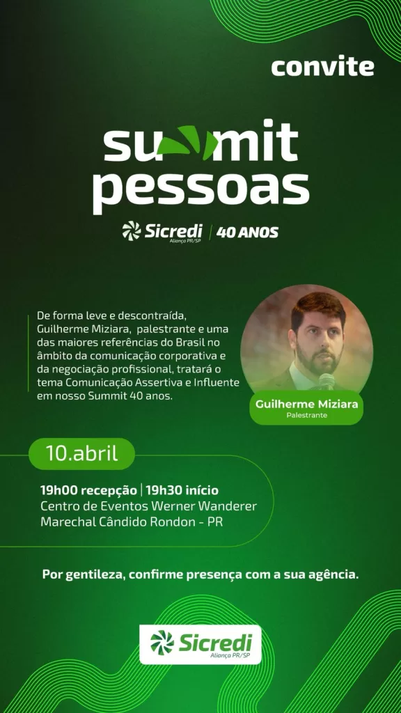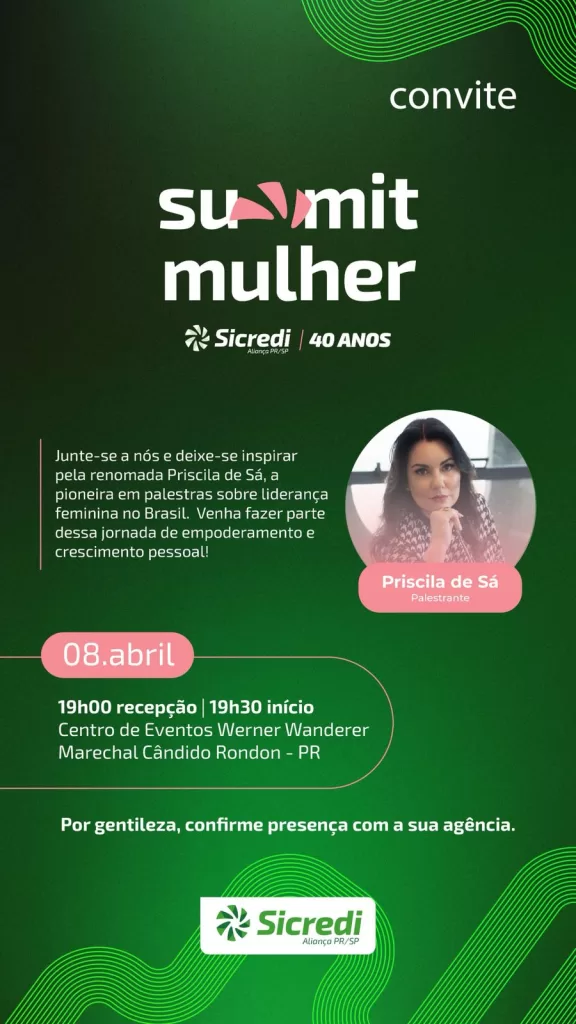 Em 2025 a Sicredi Aliança PR/SP comemora seus 40 anos e por isso montou uma programação especial de celebração ao aniversário da cooperativa. Serão quatro grandes palestras ofertadas gratuitamente para associados da Sicredi Aliança PR/SP na região oeste do Paraná. A entrada é gratuita, basta confirmar sua presença em sua agência. Não associados também podem participar. A confirmação deve ser feita em uma agência Sicredi mais próxima de você.