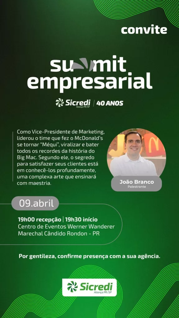 Nove de abril – Para empresários (as) – João Branco – Profissional de Marketing mais admirado do Brasil/Professor/Ex- Vice Presidente de marketing do McDonald’s