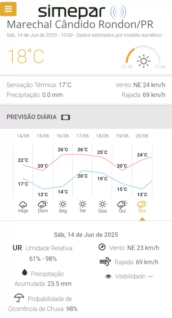 O Sistema de Tecnologia e Monitoramento Ambiental do Paraná (Simepar) aponta 23,5 milímetros de chuva para Marechal Rondon neste sábado e 7,7 milímetros para domingo.