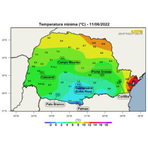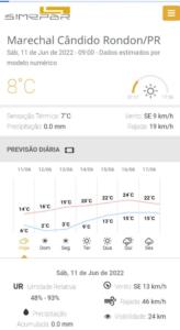 De acordo com o Simepar, há previsão de geada para Marechal Rondon no domingo e na segunda-feira (13), quando as mínimas devem chegar à casa dos 2°C e 3°C, respectivamente.