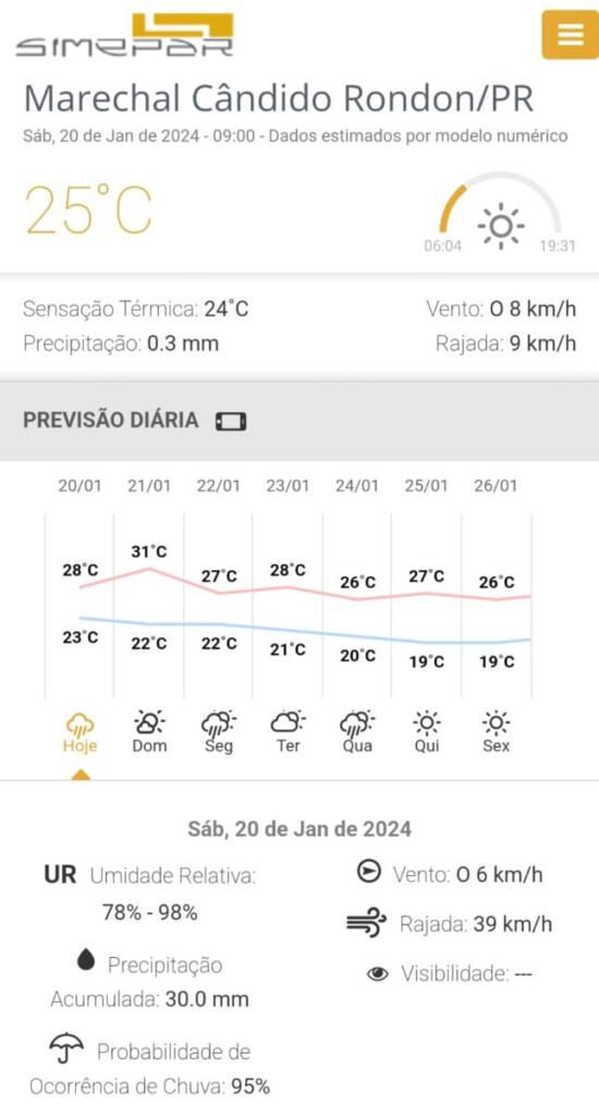 Já em Marechal Cândido Rondon a expectativa é de 30 mm de chuva, máxima de 28°C e ventos de até 39km/h.