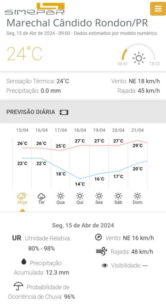 Marechal Cândido Rondon tem previsão de 12,3 milímetros de chuva para esta segunda-feira, conforme o Simepar. A temperatura máxima prevista para hoje é de 26ºC. Para terça-feira (16) o Simepar aponta 37,3 milímetros de chuva, com máxima de 25ºC. Na quarta (17) não há previsão de chuva, bem como para quinta-feira (18), para quando a mínima prevista é de 14ºC.