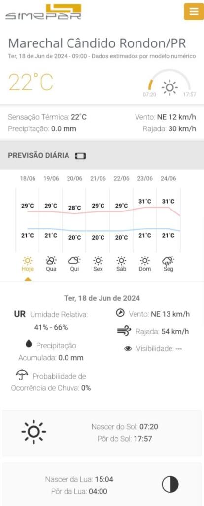 Confira a previsão para Marechal Rondon nos próximos dias, conforme o Simepar;