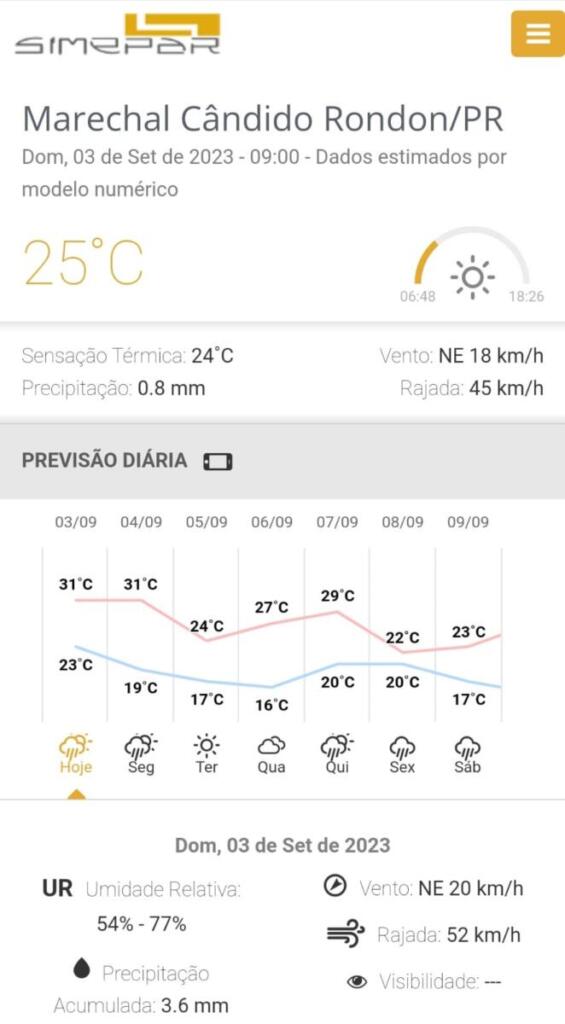 Em Marechal Cândido Rondon o domingo amanheceu com poucas nuvens. De acordo com o Simepar, para hoje há 97% de probabilidade de chuva e 3,6 de precipitação acumulada. Já para amanhã a previsão é de 8,1 milímetros de chuva. Confira o que apontam o Simepar e o Weather para a semana em Marechal Rondon: