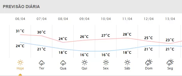 Marechal Cândido Rondon amanheceu nesta segunda-feira (6) com o sol brilhando forte e registro de 0,4 milímetros de precipitação acumulada. Segundo dados do Simepar as temperaturas devem ficar altas durante o dia variando de 24ºC e 31ºC e ventos de 47 km/h. Mas a instabilidade deve aparecer a partir de terça-feira (7), com previsão de 21,9 milímetros de chuva e máxima de 30ºC.