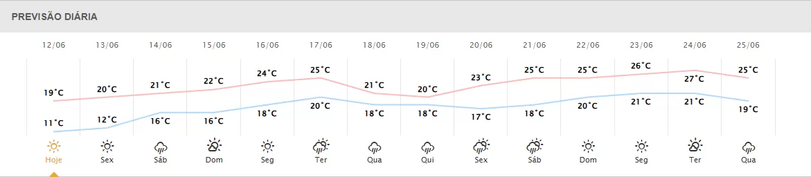 Em Toledo a previsão é de sol, termômetros variando de 9°C a 17°C, ventos de até 58km/h e umidade do ar entre 58% e 82%.