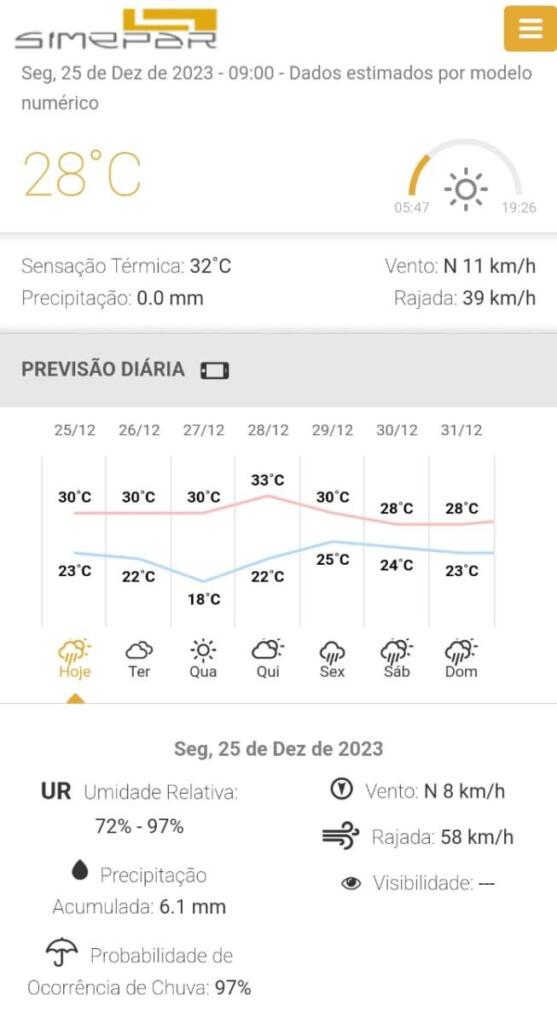 A previsão para hoje, segundo o Simepar, é de seis milímetros de chuva no município; a máxima deve ficar na casa dos 30ºC.