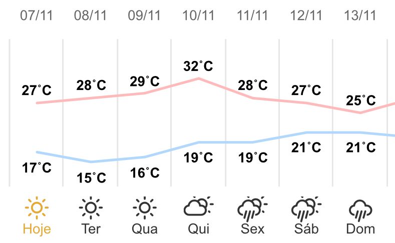 Durante a semana, as temperaturas devem alcanar 32°C na quinta-feira (10), mas, a partir de sexta-feira (11), os dados meteorológicos indicam possibilidade de chuva em Marechal Rondon, com acumulado previsto em 42,8 milímetros.