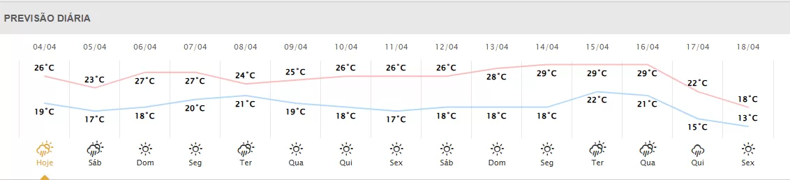 No domingo as temperaturas continuam amenas em boa parte do estado, principalmente na metade leste, com presença de muitas nuvens e chuvas de fraca a moderada intensidade com destaque para o litoral.