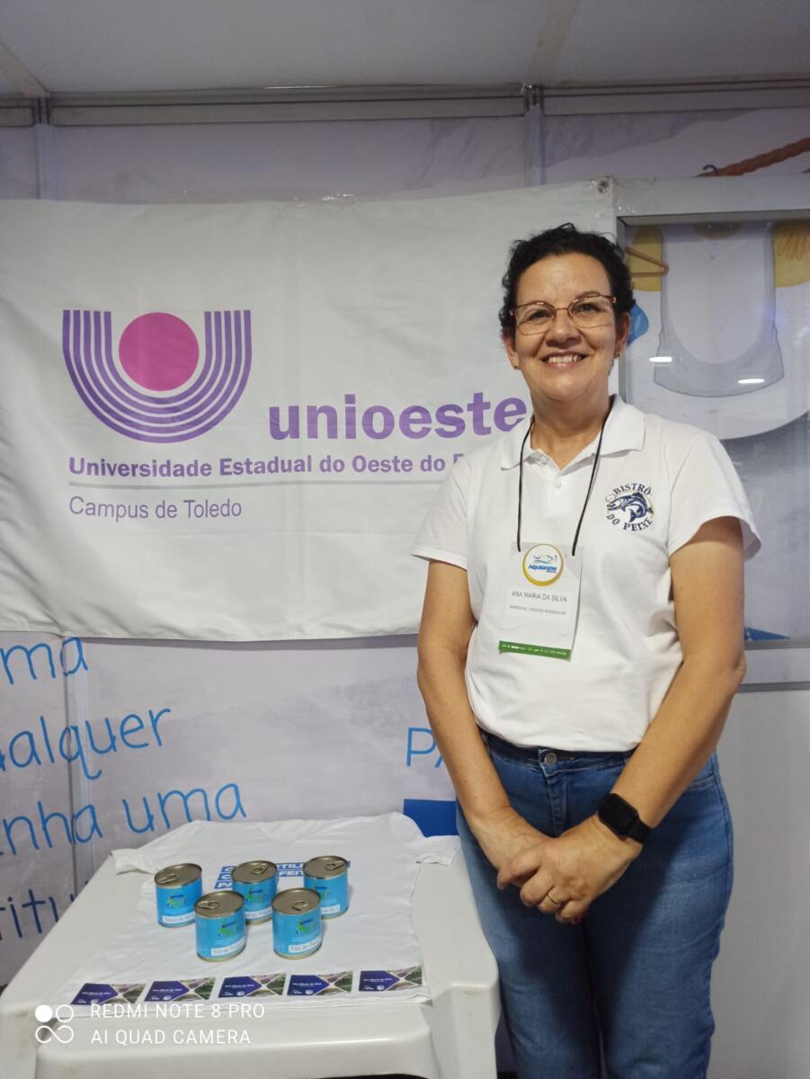 A doutoranda do Programa de Pós-graduação em Desenvolvimento Rural Sustentável da Universidade Estadual do Oeste do Paraná (Unioeste), campus de Marechal Cândido Rondon, Ana Maria da Silva, representa a Instituição no Aquishow, evento da Aquicultura Nacional que reúne todos os elos da cadeia produtiva do setor para discutir os mais diversos assuntos ligados a ele, com o objetivo de aperfeiçoar práticas de produção e seu desenvolvimento.