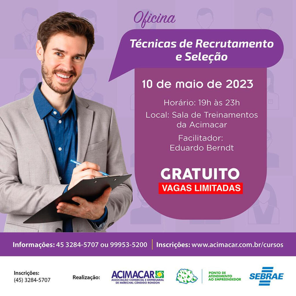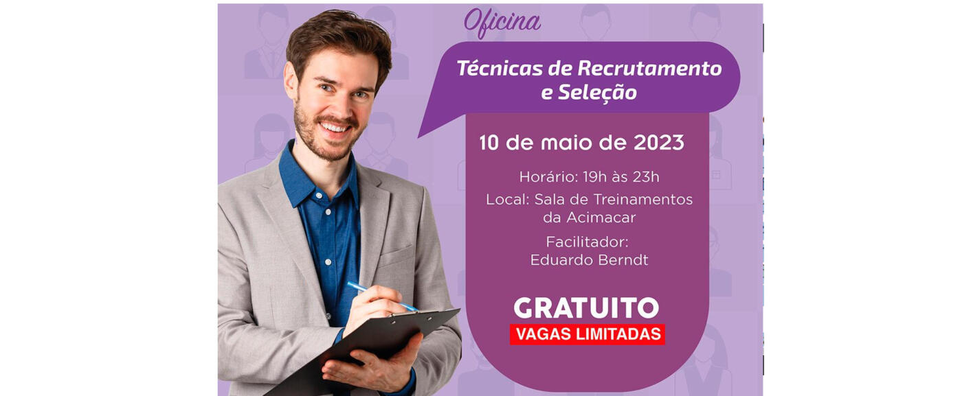 A Associação Comercial e Empresarial de Marechal Cândido Rondon (Acimacar) realiza, na próxima quarta-feira (10), a oficina gratuita “Técnicas de Recrutamento e Seleção”.