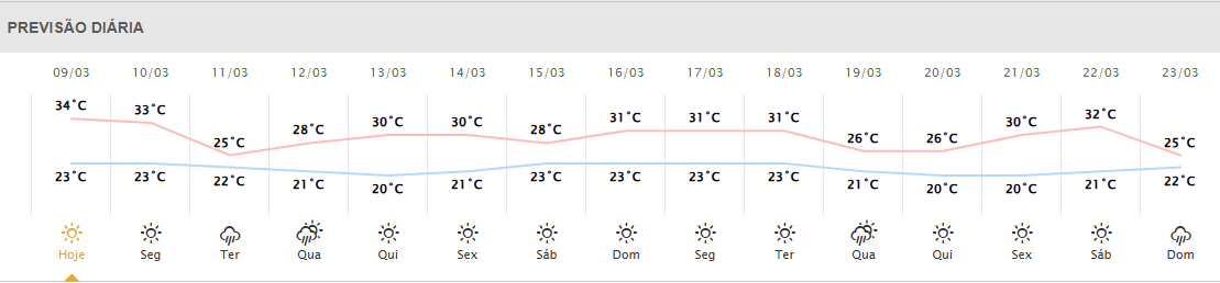 Em Marechal Cândido Rondon o domingo amanheceu com temperatura na casa dos 23°C; a máxima deve alcançar 35°C ao longo do dia. Não há previsão de chuva para hoje no município, segundo o Simepar.