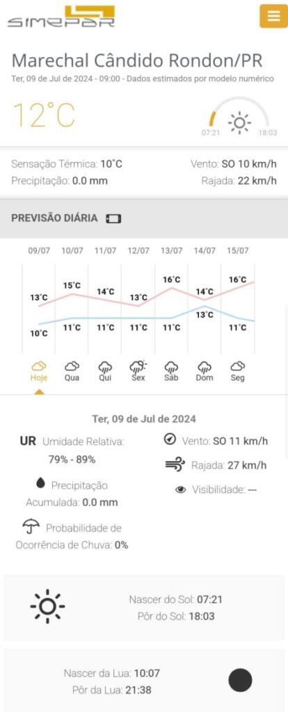 Confira a previsão do tempo para Marechal Rondon, segundo o Simepar;