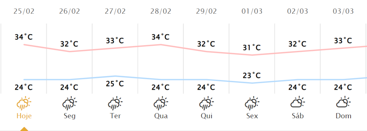 De acordo com o Simepar, a semana tem previsão de 36,1 milímetros de chuva no município rondonense; as temperaturas, por sua vez, oscilam entre 23ºC e 34ºC.