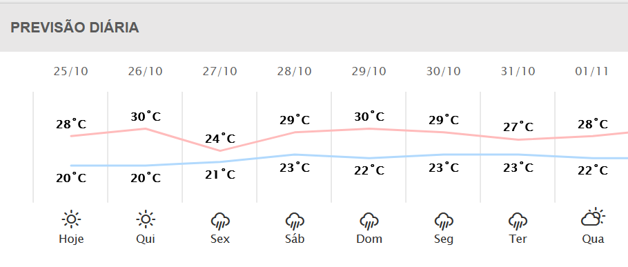Nesta quinta-feira (26) igualmente não há previsão de chuvas, mas elas devem retornar na sexta-feira (27) e, conforme o instituto de meteorologia, o tempo tende a ficar instável até a virada do mês. Para o fim de semana, inclusive, está previsto um acumulado significativo de precipitação pluviométrica.
