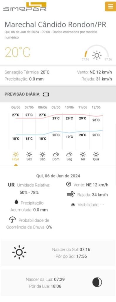 O tempo estável segue marcando presença nesta quinta-feira (6) em Marechal Cândido Rondon, de acordo com a previsão do Simepar. A temperatura alcança a casa dos 27ºC no início da tarde.