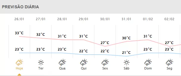 Em Foz do Iguaçu o dia também será quente com termômetros na casa dos 33°C, ventos de 29km/h e umidade relativa do ar entre 45% e 77%.