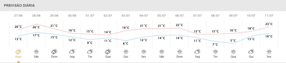 A nebulosidade fica variável com aberturas de Sol entre nuvens ao longo do dia. As temperaturas se elevam mais na faixa norte e noroeste, com até 27°C.