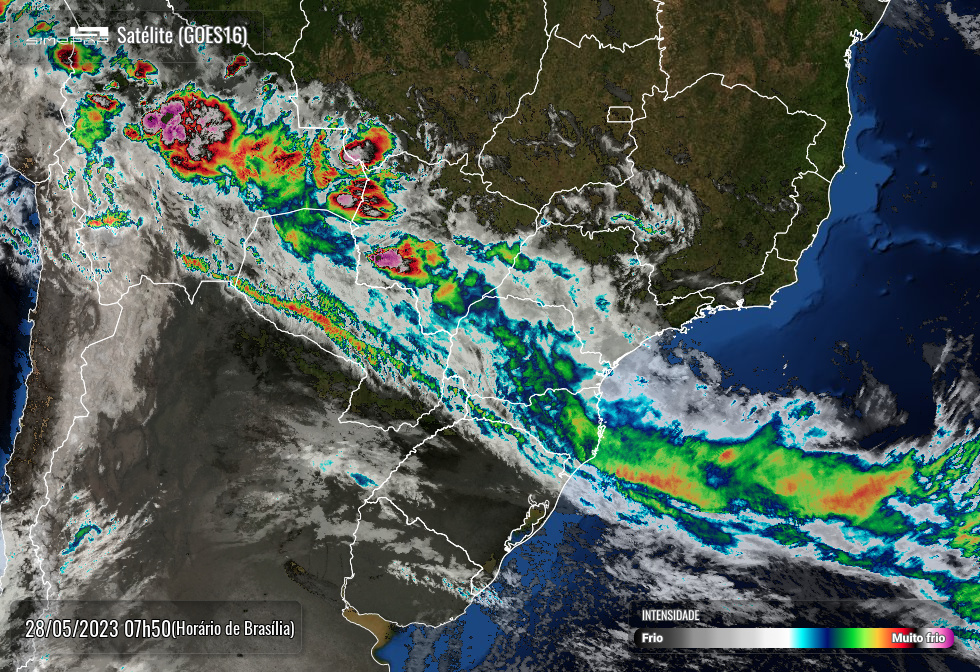 Neste domingo, o posicionamento do sistema frontal, alinhado ao fluxo de umidade, mantém a instabilidade sobre o Paraná. Com isso, chuvas continuam sendo previstas em todas as regiões paranaenses, ocorrendo em diversos momentos do dia. Também não se descarta a possibilidade de alguns temporais localizados, principalmente no interior paranaense. Temperaturas ficam amenas mesmo durante a tarde, em função das chuvas.