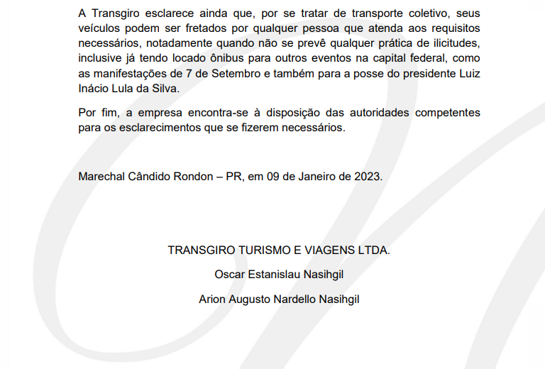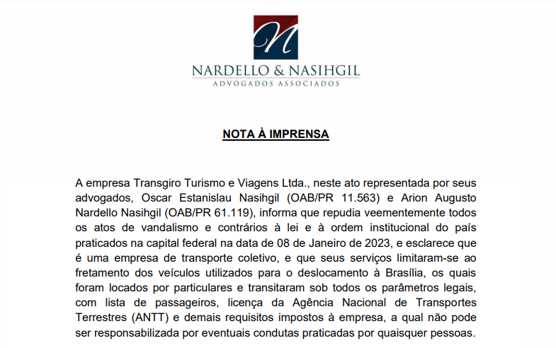 A empresa Transgiro Turismo e Viagens Ltda, por meio dos seus advogados, Oscar Nasihgil e Arion Nasihgil, emitiu, no começo da noite desta segunda-feira (9), uma nota à imprensa, por meio da qual repudia todos os atos de vandalismo e contrários à lei e à ordem institucional do país praticados na Capital Federal no domingo (8), e esclarece que é uma empresa de transporte coletivo e que seus serviços limitaram-se ao fretamento dos veículos utilizados para o deslocamento a Brasília.
