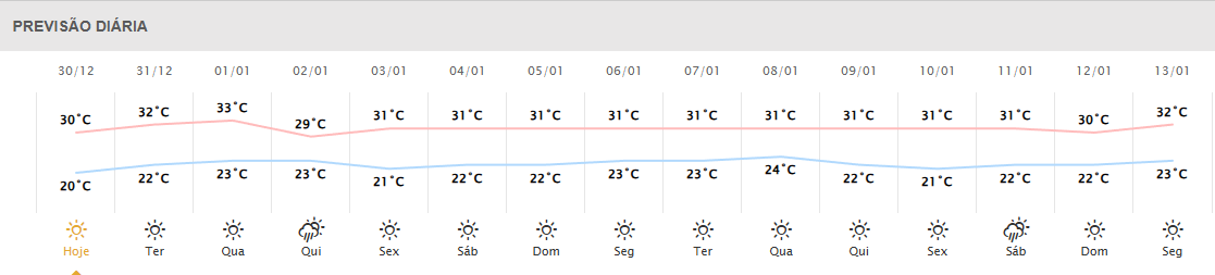 Tempo estável em Foz do Iguaçu, com termômetros variando de 22°C a 30°C e rajadas de ventos de até 16km/h.