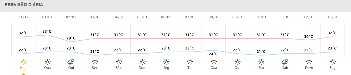 Os termômetros devem registrar máxima de 32°C, nesta tarde (31). Na cidade, não há previsão de chuva, o que favorece a visibilidade durante a explosão de fogos de artifício.