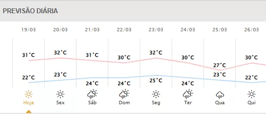 Toledo com possibilidade de 0,3 milímetros de chuva, ventos de até 18km/h e termômetros variando de 21°C a 31°C.