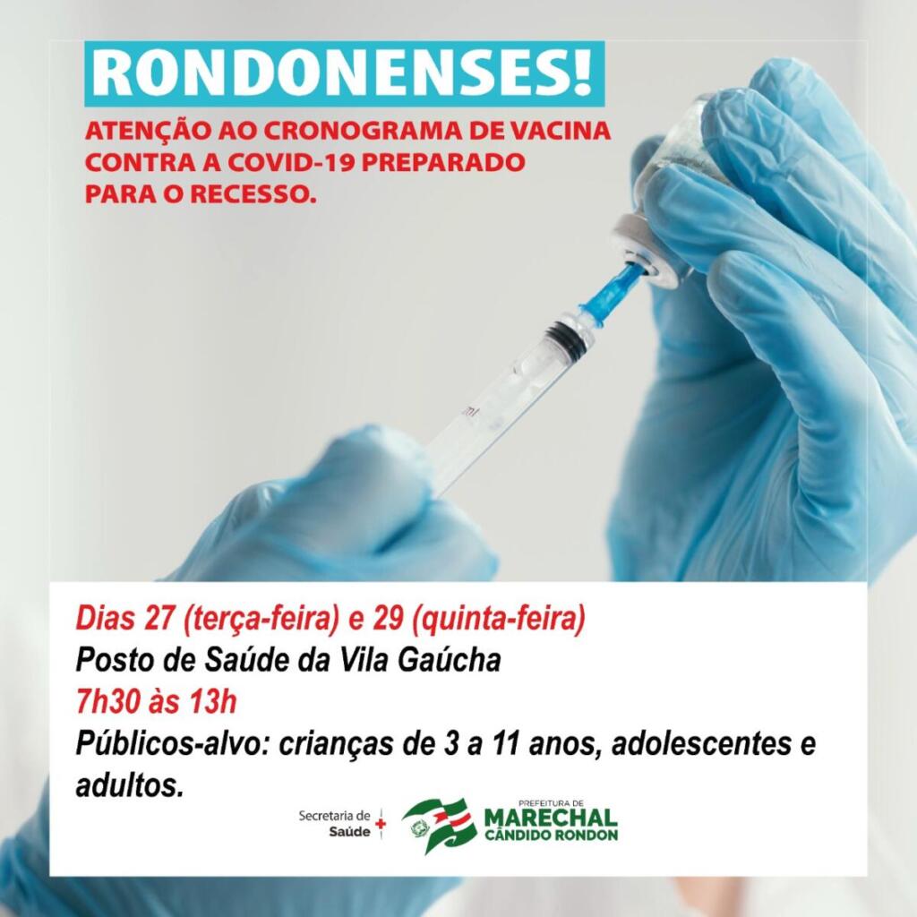 A Secretaria de Saúde de Marechal Cândido Rondon informa que a vacina contra a Covid-19 será ofertada em dois dias na próxima semana. Na terça-feira (27) e na quinta-feira (29), a aplicação do imunizante estará disponível no posto de saúde do bairro Vila Gaúcha, das 7h30 às 13 horas.