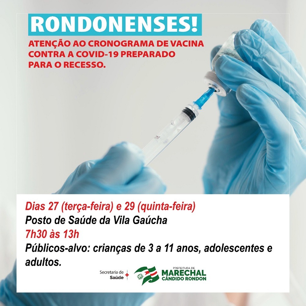 A Secretaria de Saúde de Marechal Cândido Rondon reforça que a vacina contra a Covid-19 será ofertada em dois dias nesta semana, em virtude do recesso. Nesta terça (27) e na quinta-feira (29), a aplicação do imunizante estará disponível no posto de saúde do bairro Vila Gaúcha, das 7h30 às 13 horas.