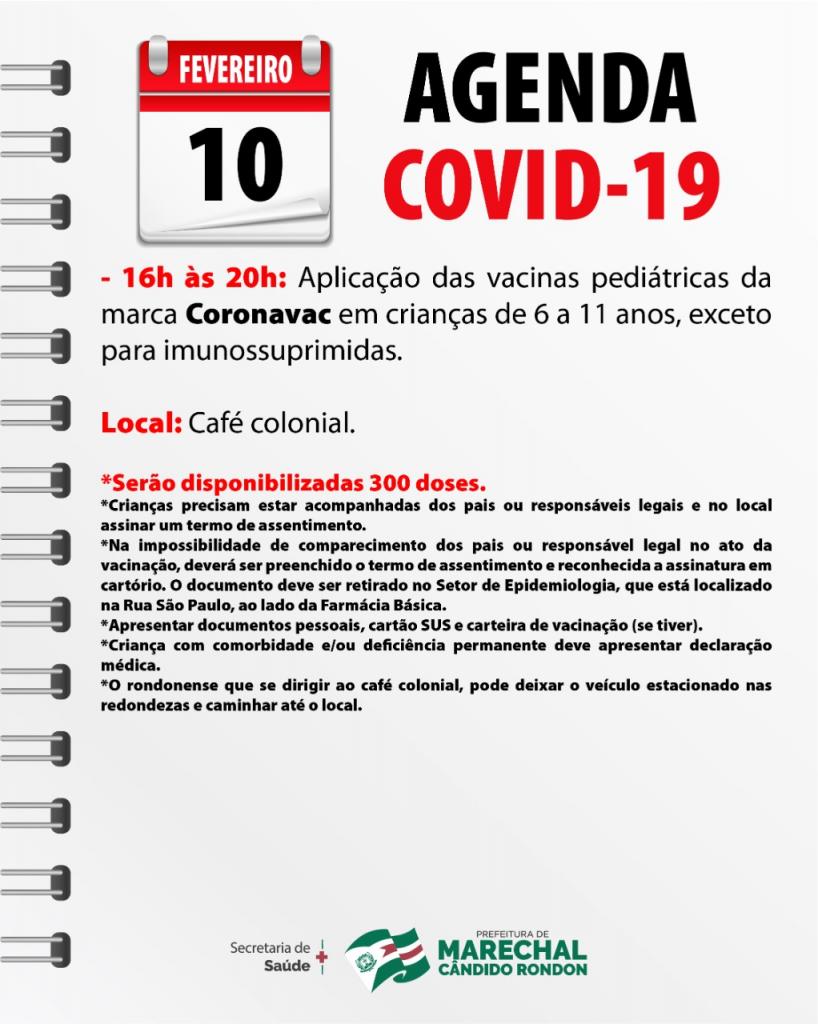 Nesta quinta-feira (10), a Secretaria de Saúde de Marechal Cândido Rondon disponibiliza 300 doses da vacina pediátrica da CoronaVac, para a vacinação de crianças de idade entre 6 e 11 anos, exceto imunossuprimidas.