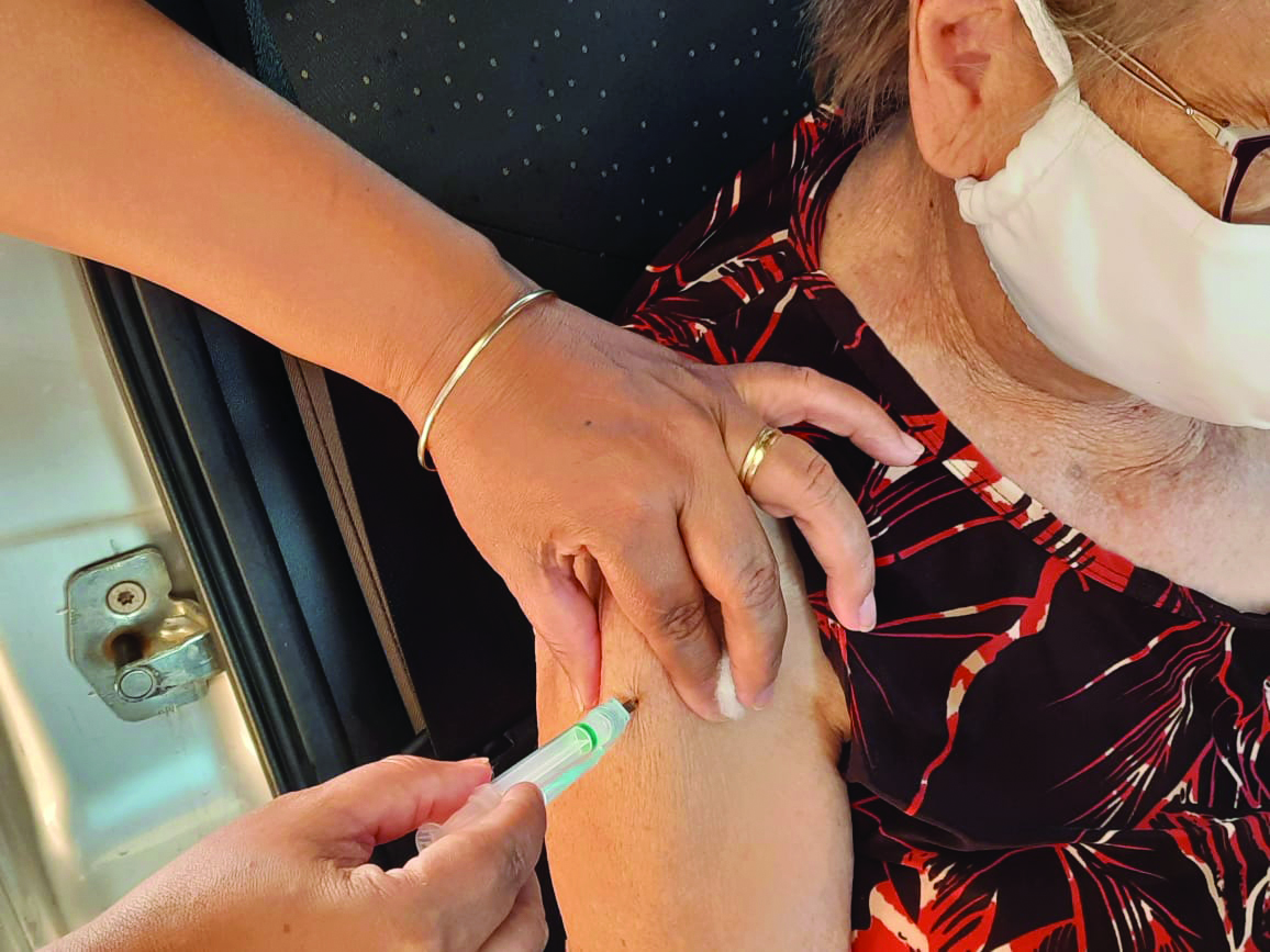 A vacinação é no sistema drive thru. Há a distribuição de senhas para o controle das doses. Para receber a imunização é necessário estar munido do cartão SUS, CPF e cartão de vacina.
