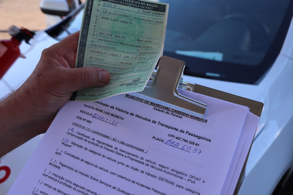 A análise contemplou, ainda, o tempo de fabricação do veículo não excedente a dez anos; extintor de incêndio compatível; taxímetro aferido e lacrado; caixa luminosa com a palavra Táxi; identificação com as inscrições Táxi Nº e Marechal Cândido Rondon; cintos de segurança em perfeitas condições; tabela de tarifas em vigor; aviso com a proibição de fumar.