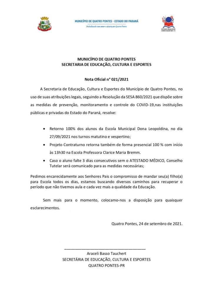 A Secretaria de Educação, Cultura e Esportes de Quatro Pontes, seguindo a Resolução da SESA 860/2021, que dispõe sobre as medidas de prevenção, monitoramento e controle da Covid-19 nas instituições públicas e privadas do Estado do Paraná, resolveu retornar as aulas presenciais com 100% dos alunos da Escola Municipal Dona Leopoldina, turnos matutino e vespertino, na segunda-feira (27). O projeto contraturno também retornará de forma presencial na sua totalidade, com início às 13h30 de segunda-feira, na Escola Professora Clarice Maria Bremm.