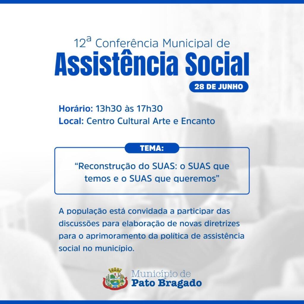 O Conselho Municipal de Assistência Social, com apoio da Secretaria Municipal de Assistência Social, realiza no dia 28 de junho, a 12ª Conferência Municipal de Assistência Social, com o tema central: “Reconstrução do Suas: O Suas que temos e o Suas que queremos”.
