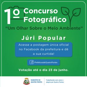 Todas as fotos pré-selecionadas serão expostas de forma anônima em postagem única na página oficial da Prefeitura de Quatro Pontes no Facebook. Nesta etapa, a votação se dará através de curtidas na foto oficial divulgada na referida rede social do órgão público, não se valendo e nem contabilizando os comentários ou compartilhamentos. A votação no Facebook ficará aberta até o dia 23 de junho. Cada participante está autorizado a fazer sua campanha para obter o maior número de curtidas.