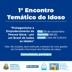 A Casa da Cultura de Quatro Pontes sediará na terça-feira (09) o 1º Encontro Temático do Idoso, tendo como tema o “Protagonismo e Empoderamento da Pessoa Idosa – por um Brasil de todas as Idades”. O evento, que é organizado pelo Conselho Municipal dos Direitos do Idoso (CMDI) e a Secretaria de Desenvolvimento Social, terá início às 08h30.
