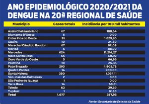 Os 18 municípios que compõem a 20ª Regional de Saúde, sendo eles Assis Chateaubriand, Diamante d’Oeste, Entre Rios do Oeste, Guaíra, Marechal Cândido Rondon, Maripá, Mercedes, Nova Santa Rosa, Ouro Verde do Oeste, Palotina, Pato Bragado, Quatro Pontes, Santa Helena, São José das Palmeiras, São Pedro do Iguaçu, Terra Roxa, Toledo e Tupãssi, tiveram ao menos um caso confirmado de dengue, entre agosto de 2020 e 31 de julho de 2021. Por outro lado, a 20ª Regional não computou nenhum óbito em decorrência da doença.