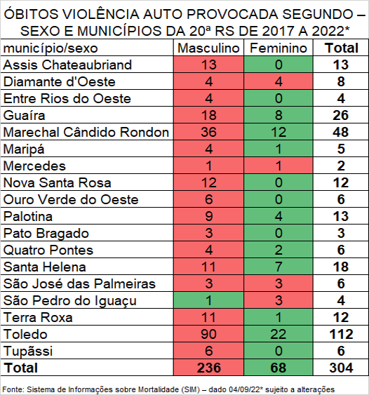 Em relação aos óbitos por violência autoprovocadas (suicídios), a 20ª Regional de Saúde registrou 304 casos de 2017 até setembro de 2022, sendo 37 apenas neste ano.