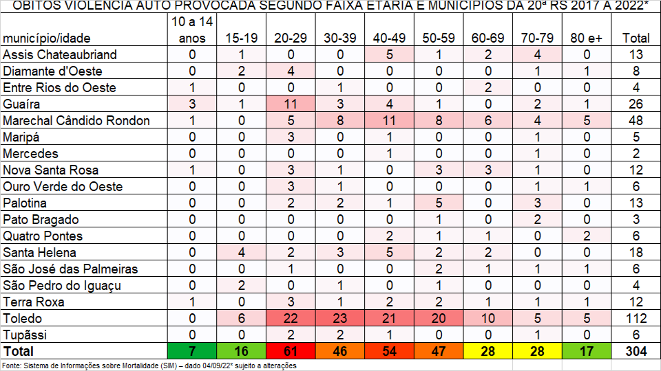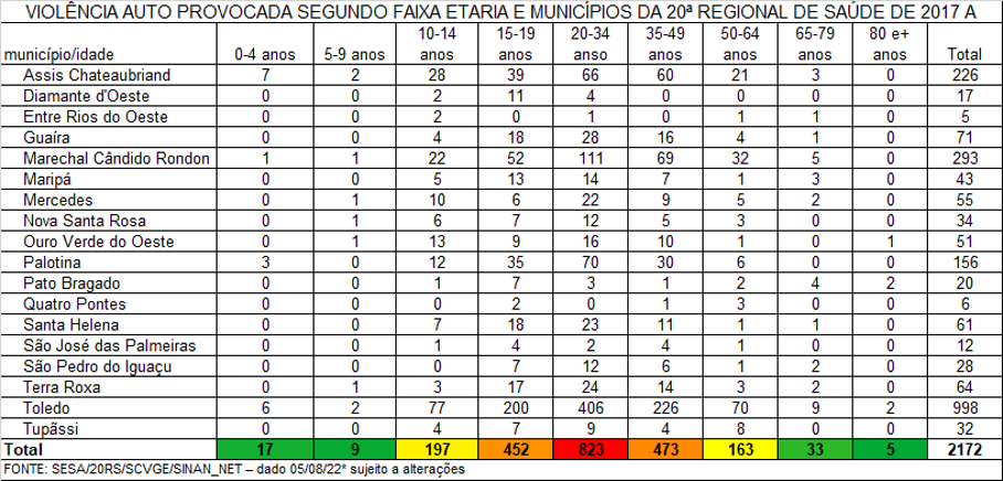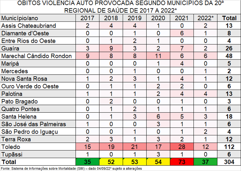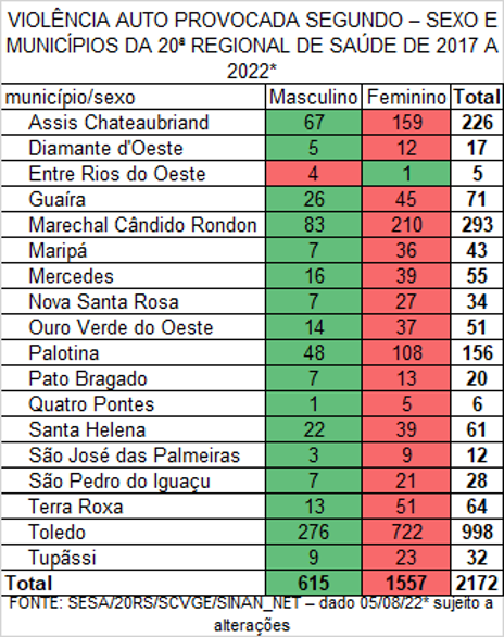 No entanto, mesmo com o trabalho de conscientização, os números de óbitos e casos de violências autoprovocadas são expressivos na 20ª Regional de Saúde, que compreende os municípios de Assis Chateaubriand, Diamante D’Oeste, Entre Rios do Oeste, Guaíra, Marechal Cândido Rondon, Maripá, Mercedes, Nova Santa Rosa, Ouro Verde do Oeste, Palotina, Pato Bragado, Quatro Pontes, Santa Helena, São José das Palmeiras, São Pedro do Iguaçu, Terra Roxa, Toledo e Tupãssi.