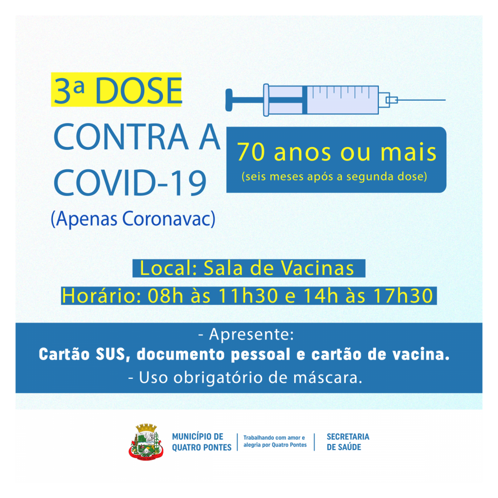 A terceira dose da Coronavac em reforço à vacinação contra a Covid-19 continua disponível para os idosos com 70 anos ou mais de Quatro Pontes, que receberam a segunda dose em intervalo igual ou superior a seis meses. Este público deve procurar a Sala de Vacinas, no Centro de Saúde, no horário das 08 às 11h30 e das 14 às 17h30.
