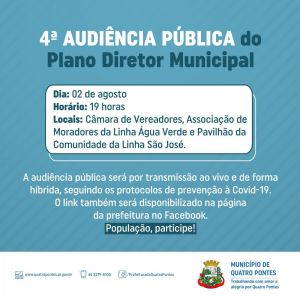 A Prefeitura de Quatro Pontes programou para o dia 02 de agosto, às 19 horas, a 4ª Audiência Pública do Plano Diretor Municipal (PDM), integrando as etapas faltantes da revisão do PDM para a conclusão do contrato nº 179/2018, com a repactuação do cronograma.