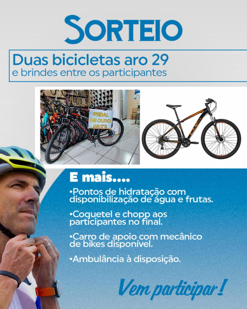 O evento prevê o sorteio de duas bicicletas aro 29, além de diversos brindes entre os participantes. Também terá distribuição de medalhas, até 300 inscrições.