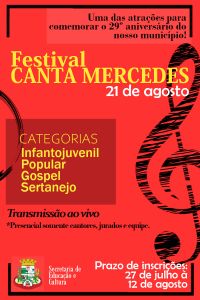 Conforme a Secretaria, estão convidados a participar do “Canta Mercedes” todos os cantores do município e os classificados no festival terão a oportunidade de representar a cidade no Festival Regional dos Municípios do Oeste do Paraná (Fermop).