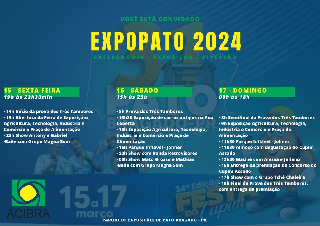 Quarenta e uma empresas dos diferentes segmentos estarão participando da Exposição da Agricultura, Tecnologia, Indústria e Comércio de Pato Bragado (Expopato) 2024, realizada pela Associação Comercial, Industrial e Agropecuária (Acibra).