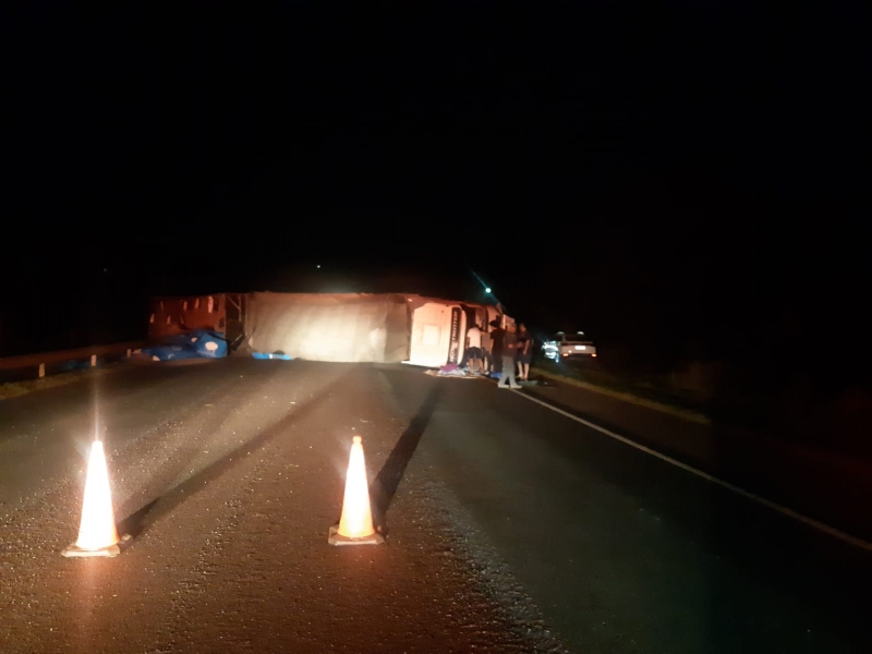Uma carreta tombou no início da noite desta quinta-feira (06), na BR-163, entre Marechal Cândido Rondon e Mercedes, nas proximidades da Dalmina, bloqueando completamente o trânsito.