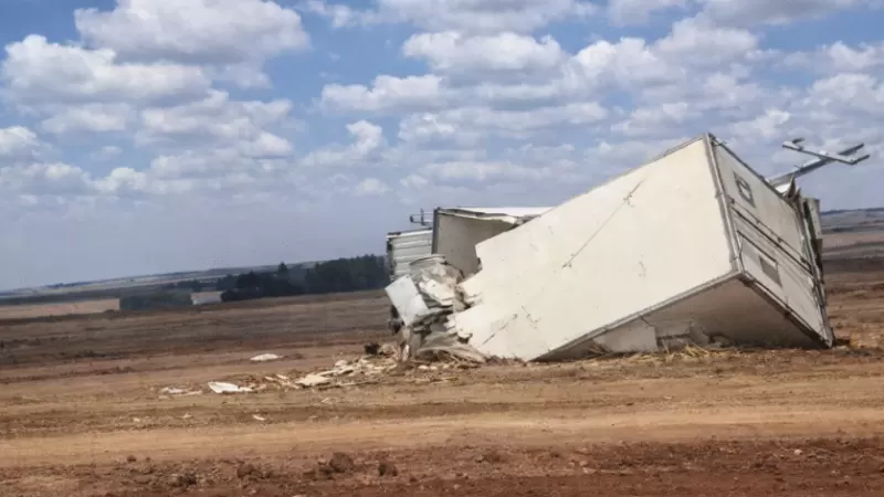 Com a força do impacto, o caminhão branco saiu da pista, adentrou uma área de plantação e acabou colidindo contra um poste . O outro caminhão envolvido no acidente também saiu da rodovia e parou em meio à lavoura.