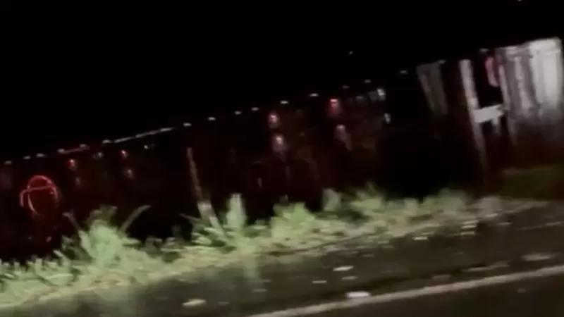 A carreta tombada permanece no local aguardando retirada.