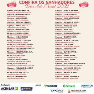 Os vales-compras poderão ser retirados pelos ganhadores a partir de amanhã (12), às 9 horas, na sede da Acinsar, junto com CPF e RG. Confira na imagem os ganhadores do sorteio.