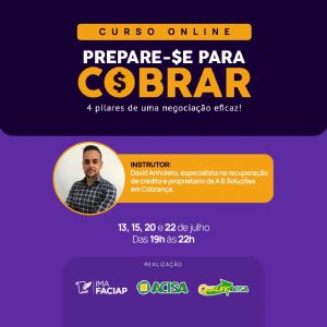 O treinamento ocorre por intermédio do Programa QualificAcisa, em parceria com o Instituto de Mediação e Arbitragem da Federação das Associações Comerciais e Empresariais do Paraná (Faciap). As aulas serão ministradas pelo especialista em recuperação de crédito, David Anholeto.